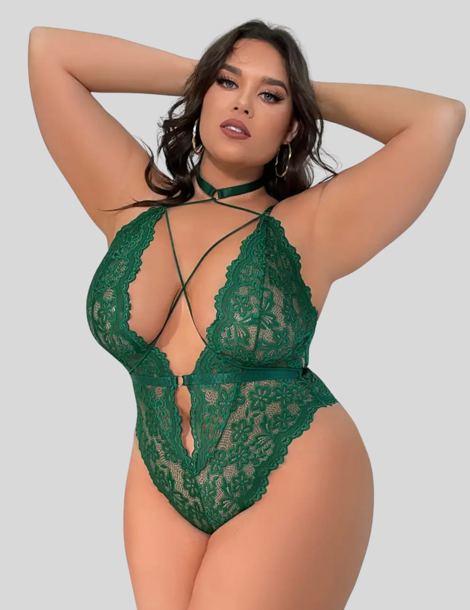 Add a little edginess to your lingerie collection with this lace plunging teddy bodysuit with choker. The crisscross pattern and choker detail are sure to leave your partner wowed and wanting more!