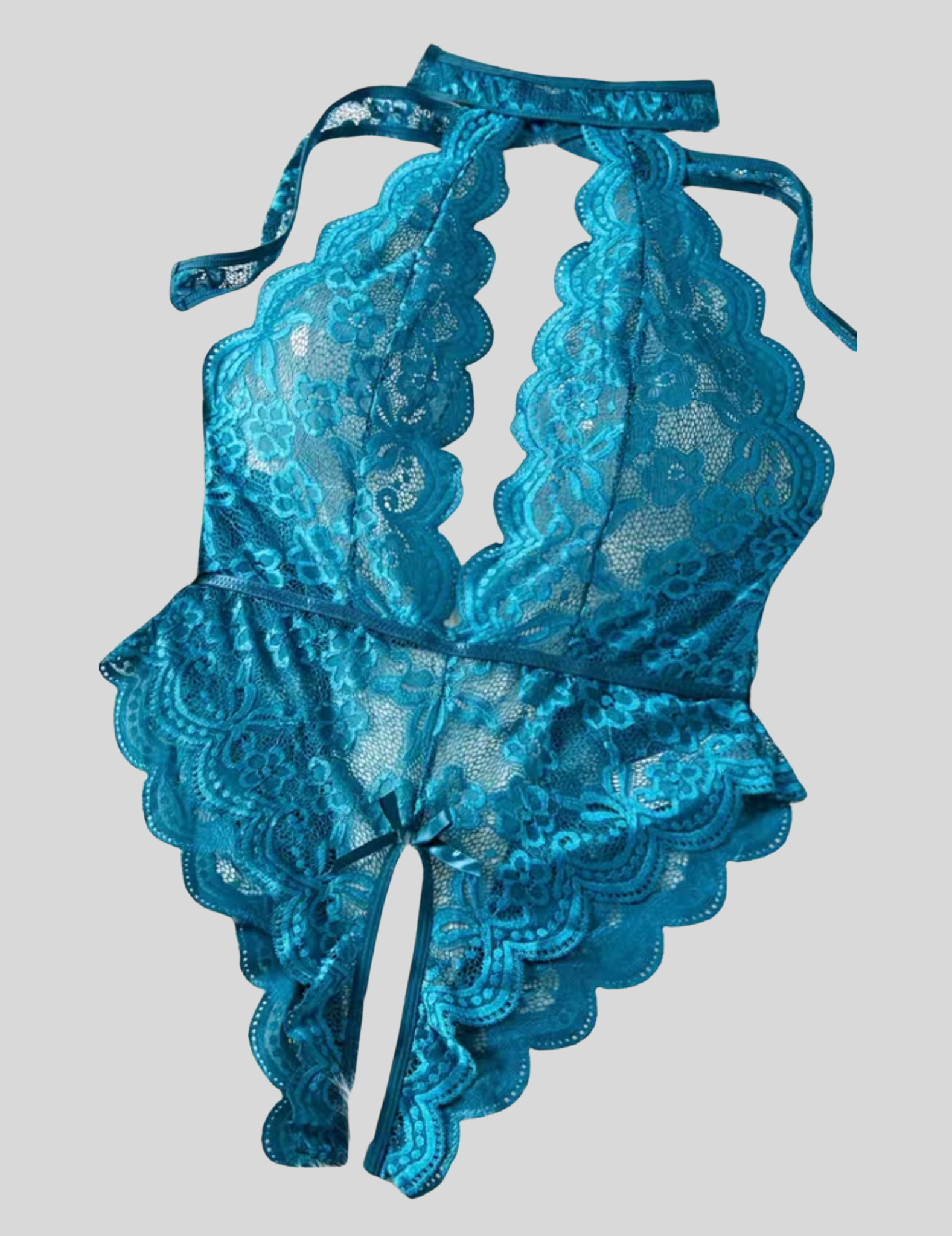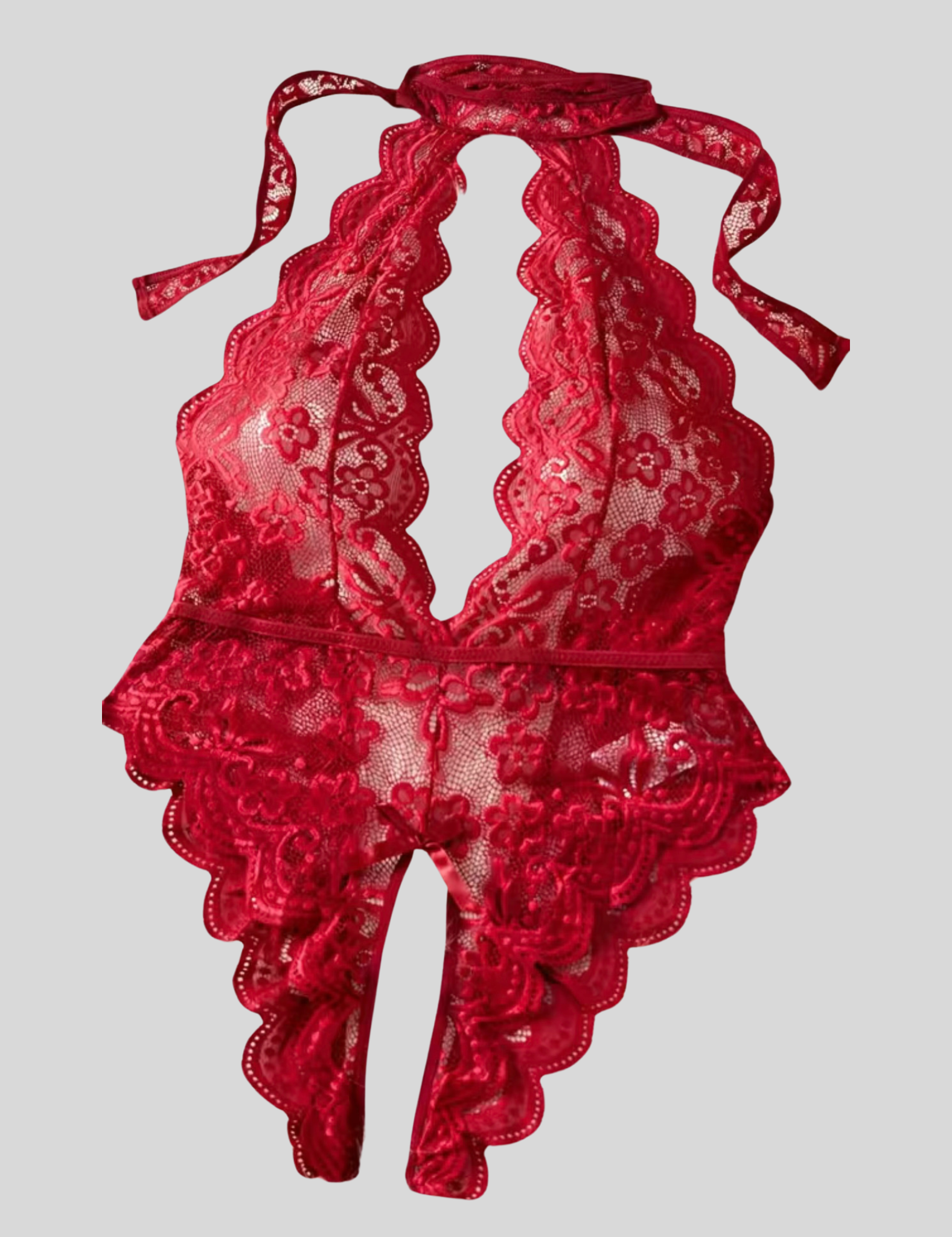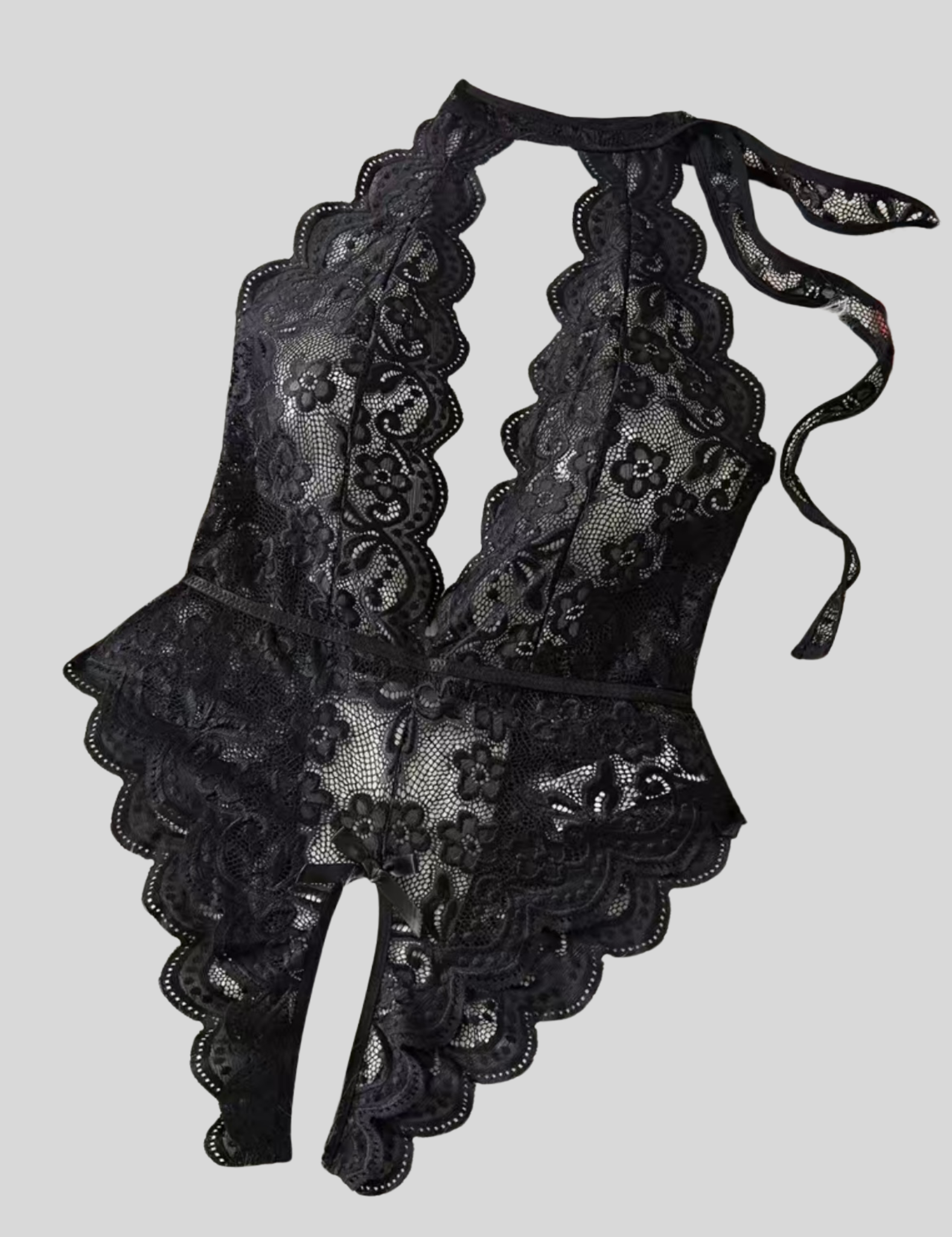 "The Wendy is the ultimate flirty lingerie piece. With a floral lace halter and scallop trim, this teddy will hug your curves and leave you feeling confident and sexy. Show off with the backless design and open crotch, while the bow accent adds a playful touch. Plus, the adjustable elastic waist band and neck tie closure make it the perfect fit for any size. Get ready to turn heads in this plunging neckline bodysuit!"