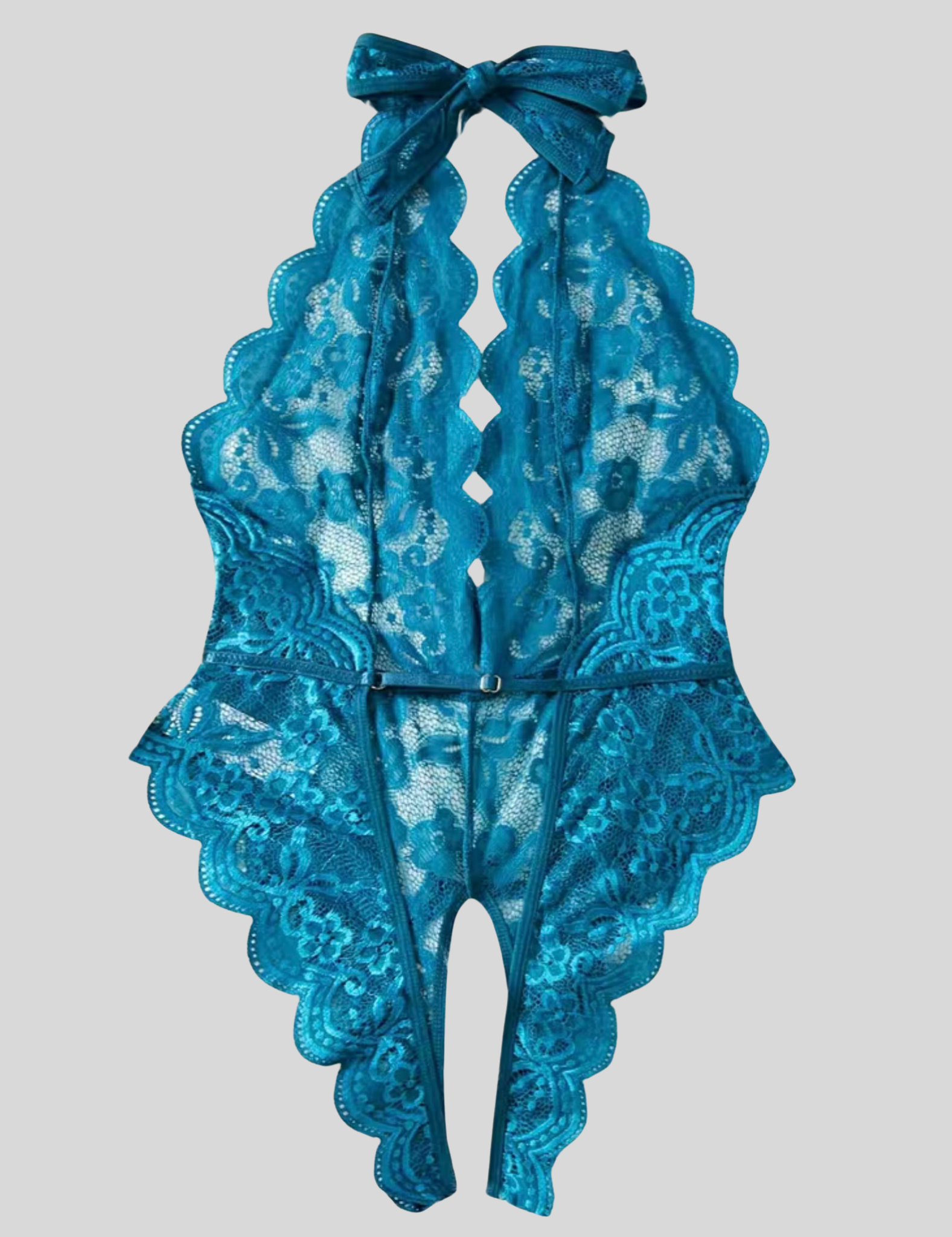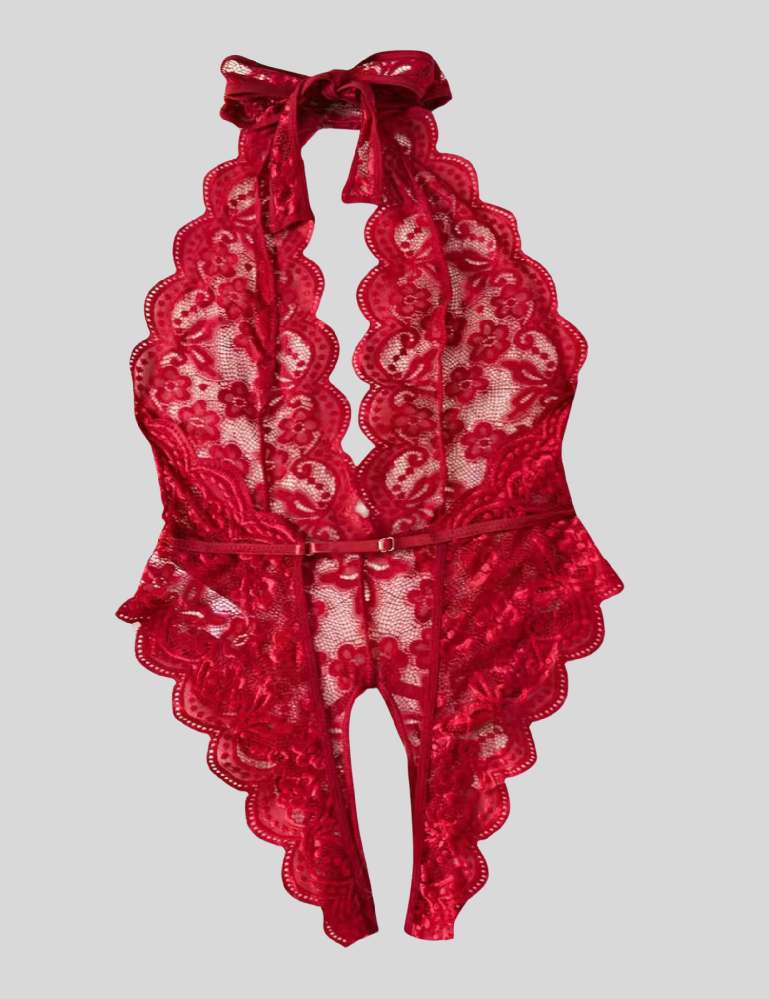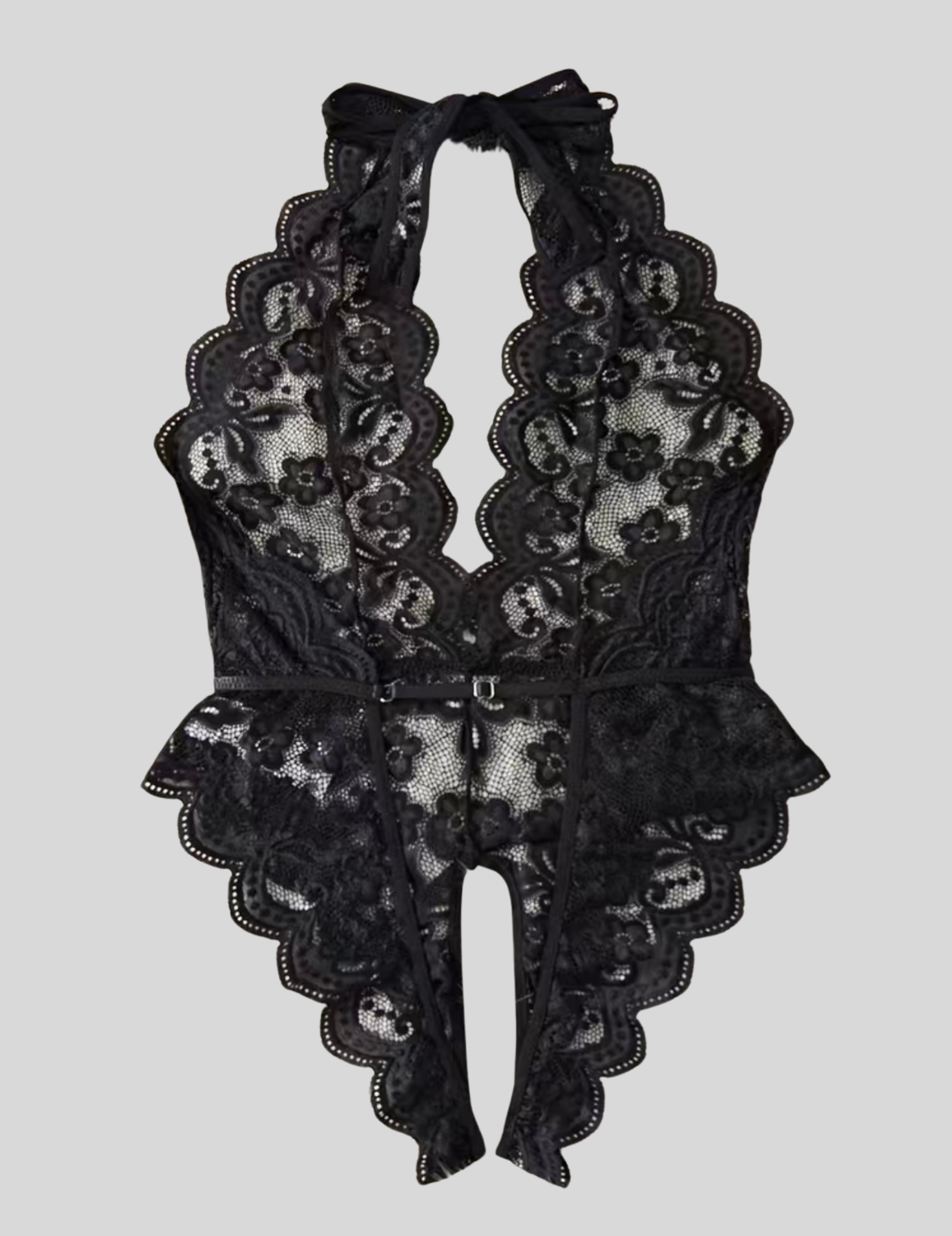 "The Wendy is the ultimate flirty lingerie piece. With a floral lace halter and scallop trim, this teddy will hug your curves and leave you feeling confident and sexy. Show off with the backless design and open crotch, while the bow accent adds a playful touch. Plus, the adjustable elastic waist band and neck tie closure make it the perfect fit for any size. Get ready to turn heads in this plunging neckline bodysuit!"